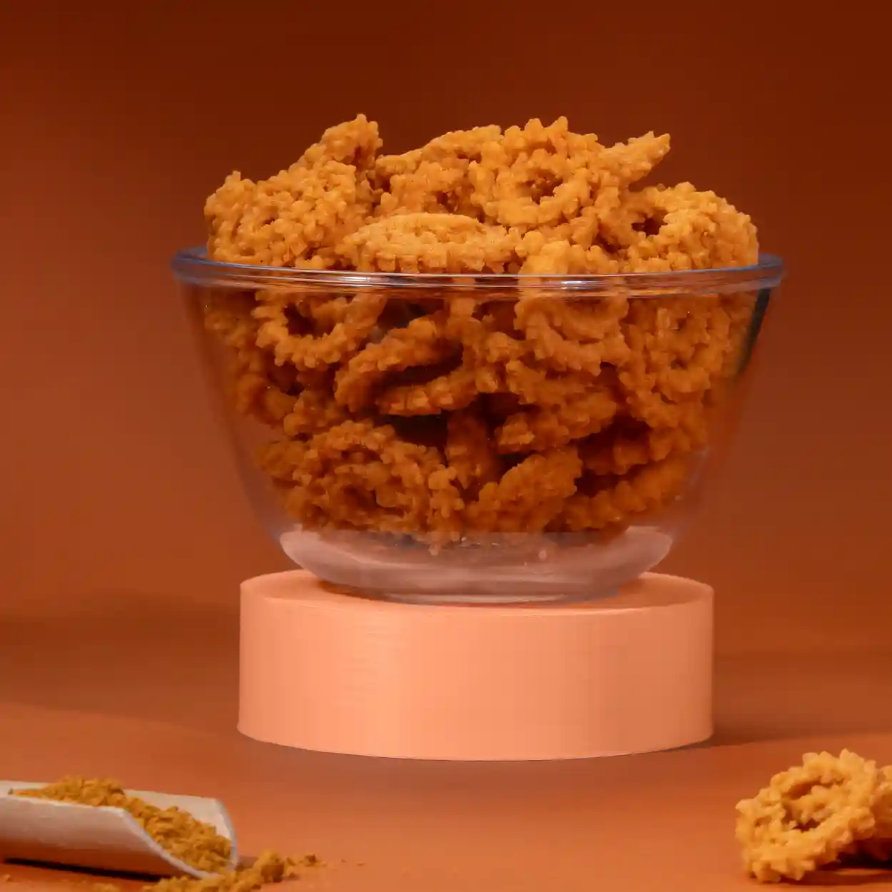 Made from rice flour dough shaped into crispy spirals and fried to golden perfection, this murukku is then coated with a flavourful masala mix that delivers spice, tang, and savoury depth in every bite.